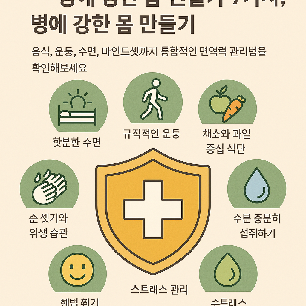 면역력은 건강의 기초입니다. 바이러스나 세균에 쉽게 노출되는 요즘 같은 시대에는 더욱 중요하죠. 이 글에서는 일상에서 실천할 수 있는 면역력 강화 생활 습관 7가지를 소개합니다. 음식, 운동, 수면, 마인드셋까지 통합적인 면역력 관리법을 확인해 보세요.