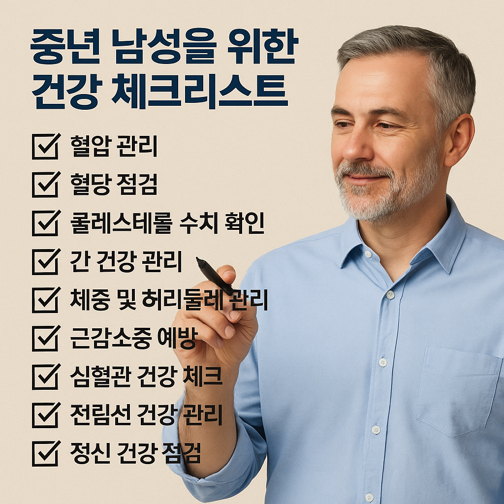 중년은 건강이 급격히 변하는 시기입니다. 특히 남성은 심혈관 질환, 당뇨, 근감소증 등 다양한 위험 요인에 노출됩니다. 이 글에서는 중년 남성이 꼭 점검해야 할 건강 항목 10가지를 정리하고, 이를 관리하는 방법까지 함께 안내합니다. 건강한 중년 이후를 위해 지금부터 체크하세요.