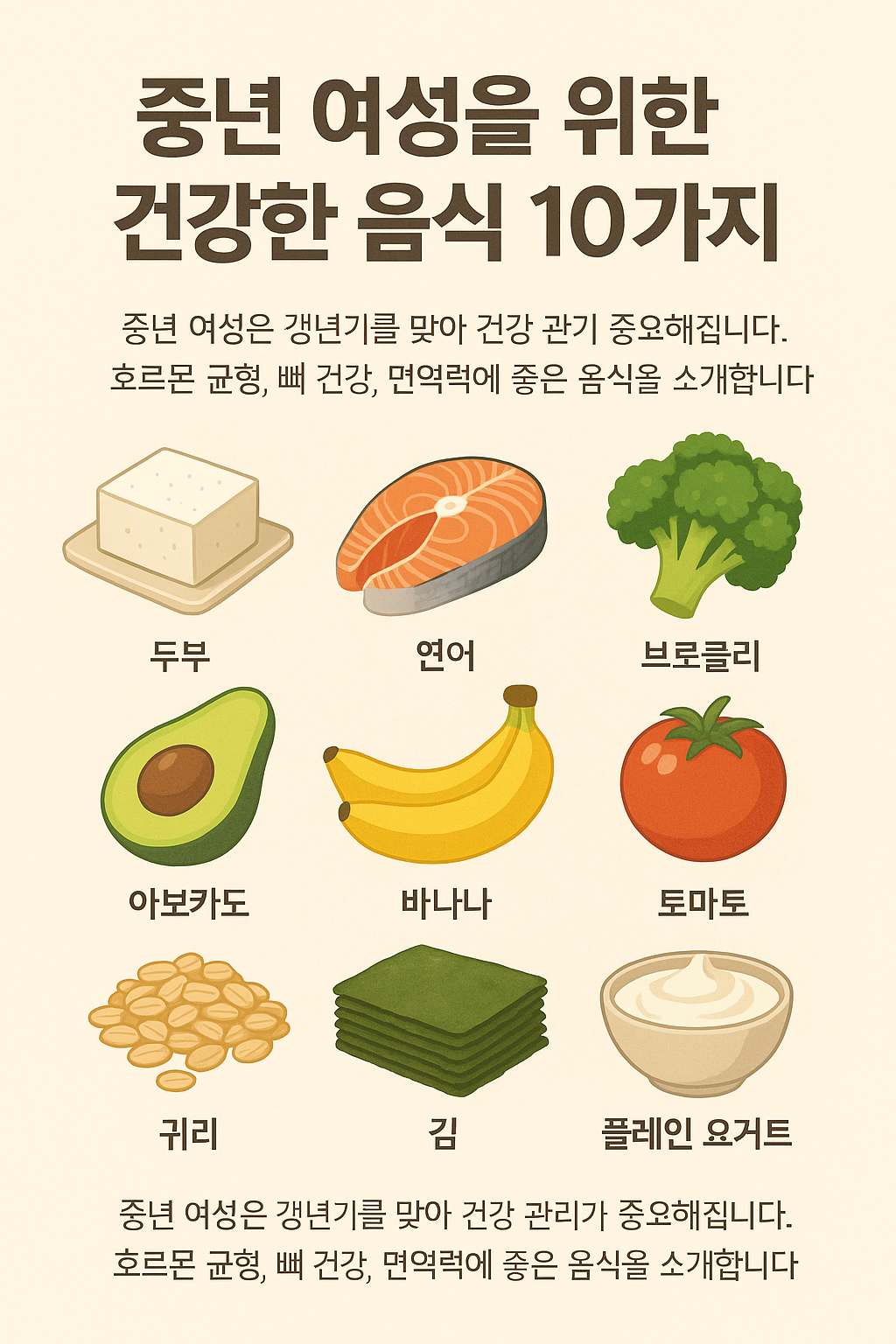 1. 두부 – 식물성 단백질과 칼슘이 풍부해 뼈 건강과 여성호르몬 균형에 도움을 줍니다. 2. 연어 – 오메가-3 지방산이 풍부하여 심혈관 건강과 피부 탄력 유지에 좋습니다. 3. 브로콜리 – 식이섬유와 비타민C가 풍부해 면역력 강화에 탁월합니다. 4. 검정콩 – 식물성 에스트로겐이 풍부해 갱년기 증상 완화에 도움을 줍니다. 5. 아보카도 – 건강한 지방이 풍부해 혈관을 보호하고 포만감을 유지해줍니다. 6. 바나나 – 칼륨과 마그네슘이 풍부해 근육 경련을 줄이고 스트레스 완화에 좋습니다. 7. 김 – 요오드와 철분이 풍부해 갑상선 건강과 빈혈 예방에 도움을 줍니다. 8. 토마토 – 항산화 성분 리코펜이 풍부해 피부 노화 방지에 효과적입니다. 9. 귀리 – 콜레스테롤을 낮추고 혈당 조절에도 도움을 주는 고섬유질 곡물입니다. 10. 플레인 요거트 – 장 건강을 도우며 칼슘 공급원으로도 우수합니다.