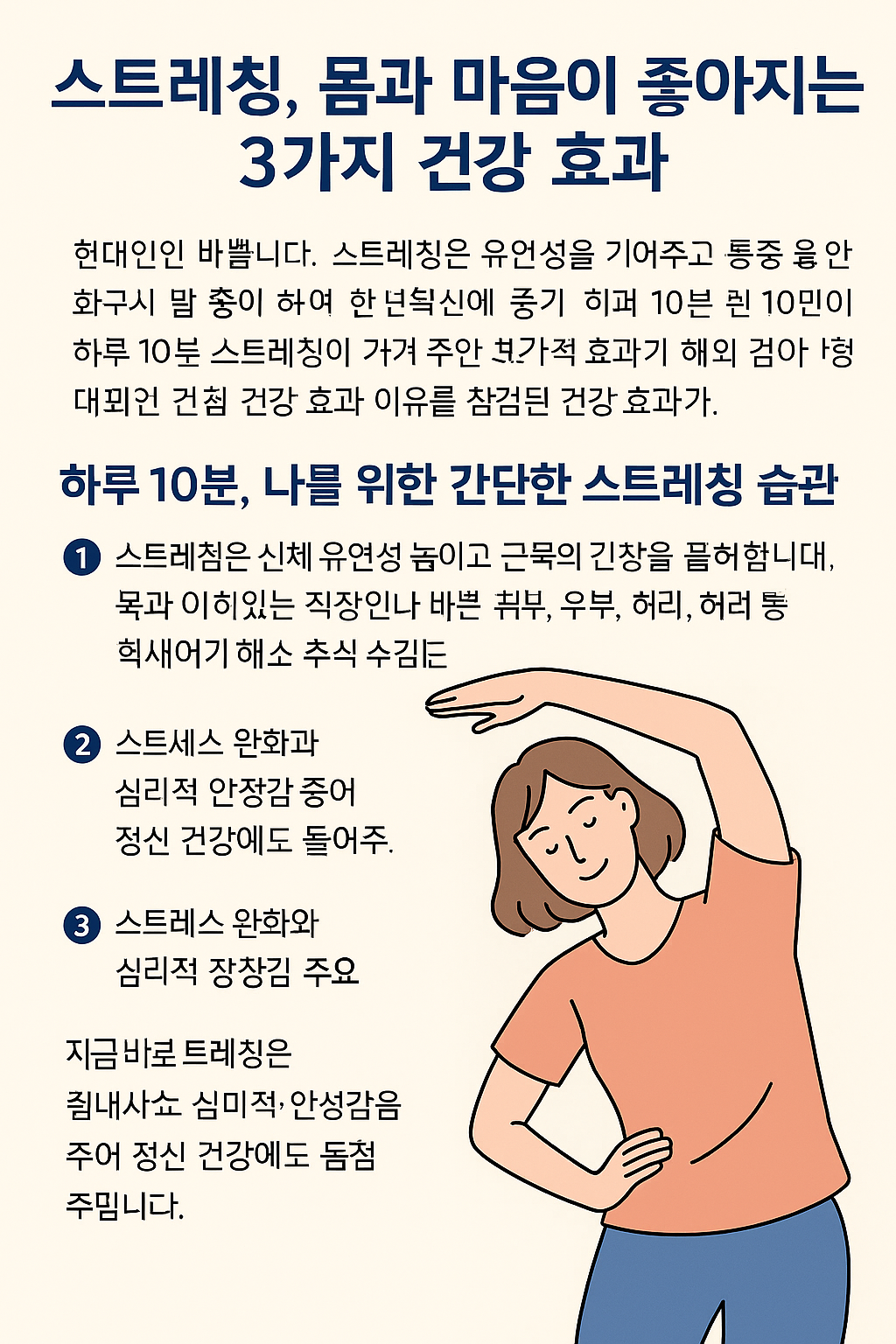 스트레칭은 신체 유연성을 높이고, 통증을 줄이며, 혈액순환과 자세 개선, 정신적 안정에도 도움이 됩니다. 바쁜 현대인에게 하루 10분 스트레칭은 작지만 강력한 건강 습관입니다. 이 글에서는 스트레칭이 가져오는 3가지 대표적인 건강 효과를 소개합니다.